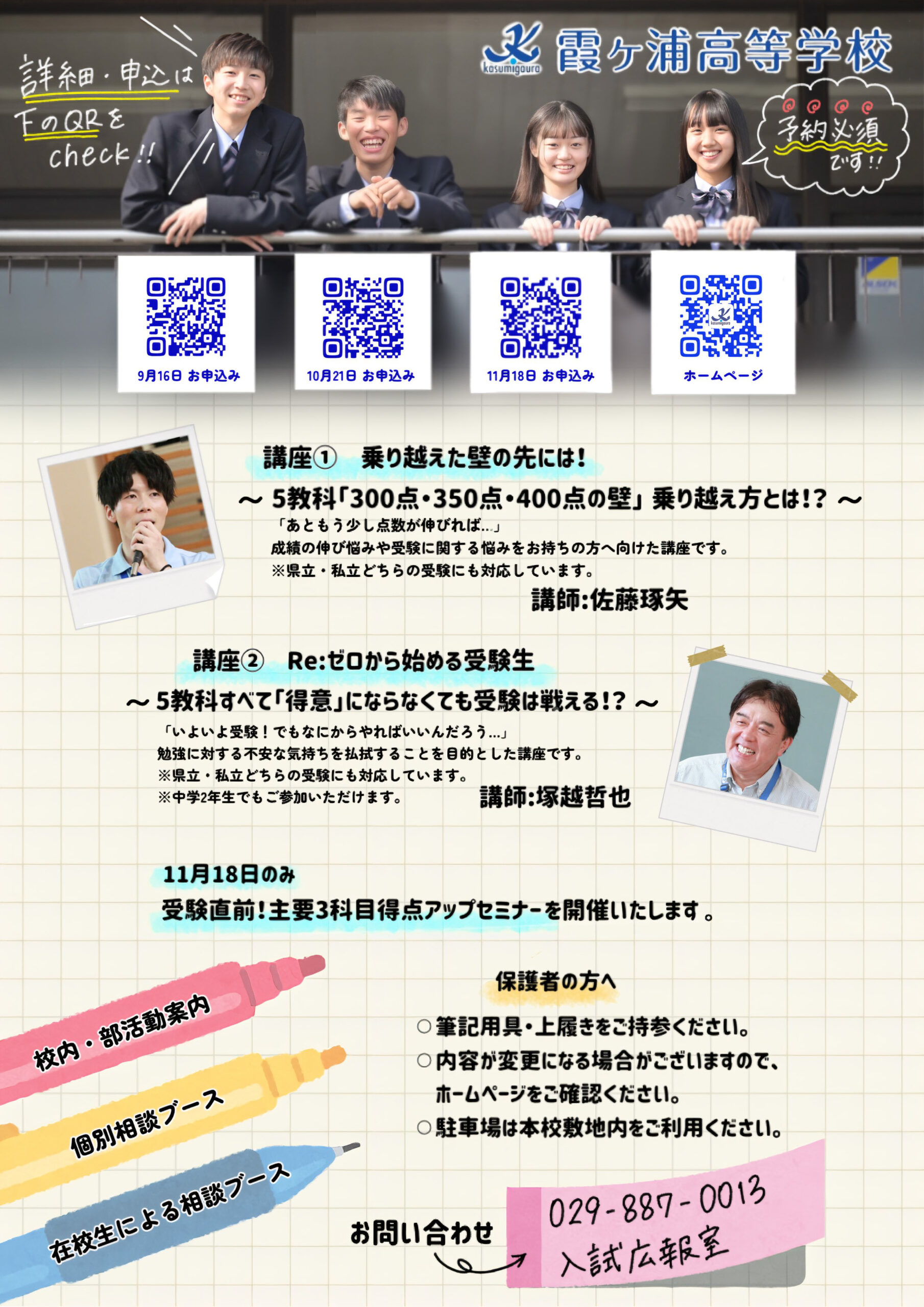 2020.06.27 スライド1スライド22024夏-022024夏-032024夏-01 お知らせ一覧 【11/15 KLC(数学スタンダード)参加の方へ】 11月15日(土)実施の霞ヶ浦ラーニングコモンズにご参加いただきありがとうございました。 当日、数学スタンダードの講座を受講された中学生の方へ、数学の解答となります。 ご確認いただき、受験勉強に役立ててください。 数学の解答はこちら 2025.11.17 【令和8年度 学費・諸費用に関するお知らせ】 令和8年度入学生の学費・諸費用の納入額となります。国、県の政策により、変更になる場合がございます。在校生に関しましては、改めてお知らせいたします。 ご不明な点がありましたら本校広報室までお問い合わせください。 学校長 詳細はこちら 2025.11.142025.11.18 【チアダンス部 出演のお知らせ】 10月26日(日) 11:00~「ミライノネフェス」に出演します。 詳細はチラシをご覧ください。 2025.10.162025.10.17 学校生活アンケートを実施しました。 令和7年9月10日(水)に実施いたしました「学校生活アンケート」において、生徒からいじめ等に該当する事案の報告はありませんでした。引き続き、本校のいじめ防止基本方針に沿って、教職員が一丸となり、未然防止、早期発見・早期解決に努めてまいります... 2025.10.092025.10.10 【チアダンス部 出演のお知らせ】 10/5(日)あみプレミアムアウトレット AUTUMNイベントに出演します。 1部11:00〜、2部12:00〜 2025.09.29 霞ヶ浦通信一覧 【探究 活動報告】 12月7日(日)、探究高校生団体Froot’sの2名が、茨城frogs主催「IBARAKI LEAP DAY 2025」にて、プレゼンテーションを行いました。 2年8組 荒井 希風 「食育×防災×農業を包む!いばらきさつまいも茶きんキット... 2025.12.08 【避難訓練を実施しました。】 12月5日(金)、寮生の夜間避難訓練を実施しました。日時の詳細は伝えず、抜き打ちでの実施でしたが、各自が防寒対策をはじめ、非常時持ち出し袋を持ち出すなど、真剣に臨むことができました。 2025.12.06 【チアダンス部 活動報告】 11/30(日)に開催されたパフォーマンスコンテストレインボーカップ2025。第1回大会から出場し続け、念願のグランプリ(レインボー賞)を受賞しました!! チョコレートプラネットの「風呂キャンセル界隈」の曲を題材に、コミカルな作品を披露。... 2025.12.06 【ヨット部 表敬訪問をしました。】 10月27日(月)、霞ヶ浦高校ヨット部が茨城県庁にて柳橋教育長を表敬訪問しました。柳橋教育長をはじめ関係課の皆様に、全国高等学校総合体育大会の優勝報告をしました。 2025.12.04 部活動戦績報告 【バレーボール部 戦績報告】 春の高校バレー全日本バレーボール高等学校選手権大会茨城県予選会 日程 令和7年11月1日(土)、2日(日) 会場 日立池の川さくらアリーナ <結果> ■男子 ベスト4 1回戦 霞ヶ浦 2-0 下舘第一 2回戦 ... 2025.12.032025.12.04 イベント 公式Instagram kasumigaura_hs 霞ヶ浦高等学校の公式アカウントです。このアカウントは発信のみ行い,個人への返信は行いません。お問い合わせは本校へ直接ご連絡ください。 X(旧Twitter)→@kasumigaura_hs YouTube→kasumigaura_hs_Channel Trick or Treat!!👻💫 今日はハロウィン さらに読み込む... Instagram でフォロー 公式X Tweets by kasumigaura_hs
